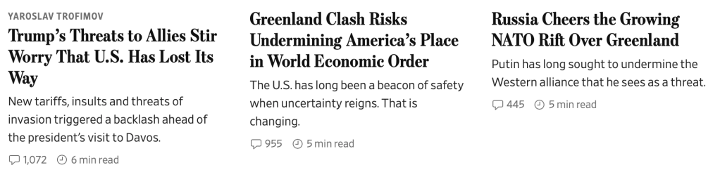 Trump has been told—probably by the Solicitor General, the unfortunately named Mr. Sauer—that he is going to lose the tariff case in the Supreme Court. Bigly. Faced with that grave forthcoming affront to his fee-fees, Orange Mussolini has devised an insane Hail Mary pass: use tariffs to force Europe to give him Greenland, thereby “demonstrating” to the Supreme Court the great “value” of his favorite play-pretty, his usurped power to bully other countries with tariffs and threats of tariffs.