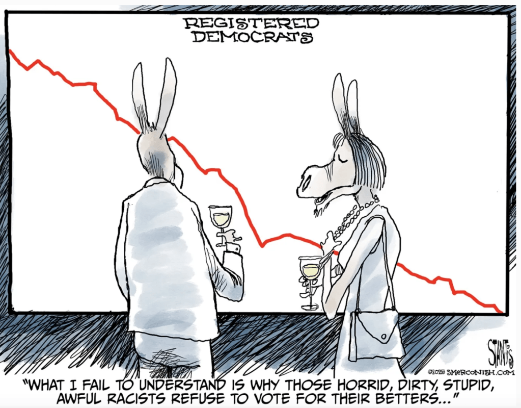 Down in Texas, Team Red—having partaken generously of Trump’s Kool-Aid—thinks that Orange Man’s popularity in the Lone Star State will continue from strength. In particular, they think the Latino community is overjoyed by the ICE arrests, and will reward Mango Mussolini in 2026 by increasing their support in congressional districts bordering on the Rio Grande.