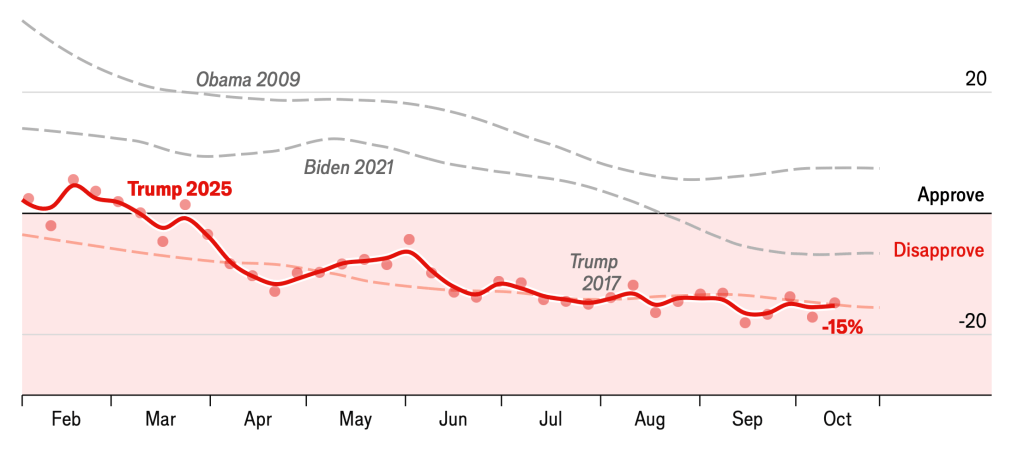 I perceive a significant—and surprising—information disconnect. Some, like the Politics Monday team on PBS Newshour, say his popularity remains stable. Others, like Heather Cox Richardson, and many others, say it’s tanking.