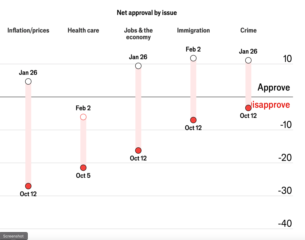 Net approval, over time, on five broad issues: