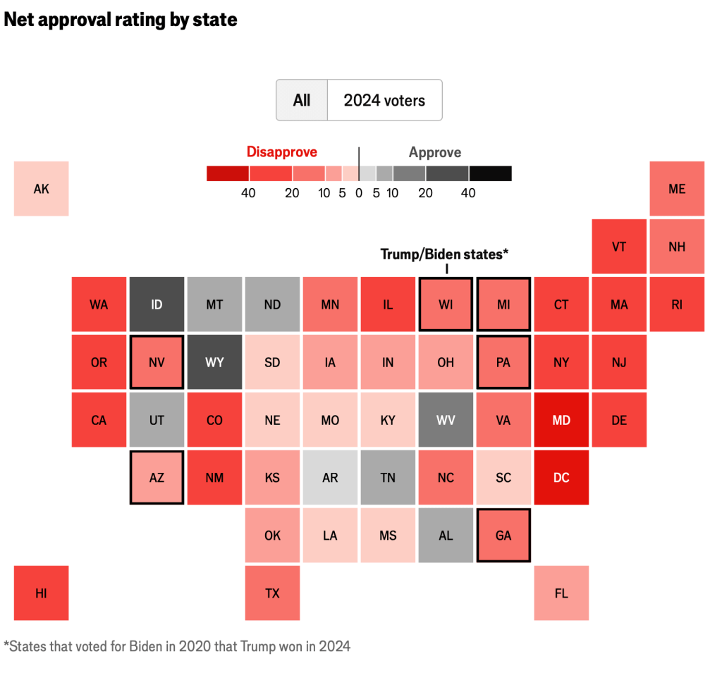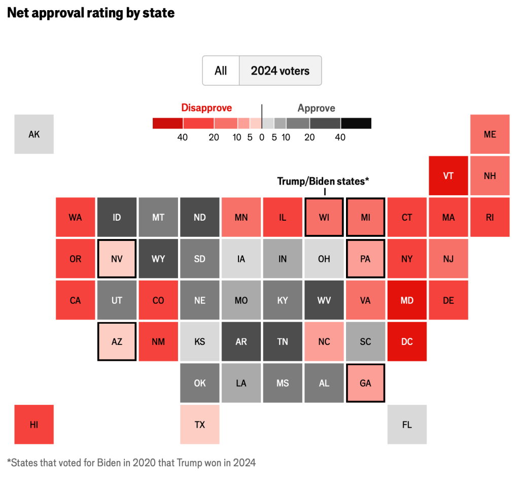 And last, but far from least, current net approval, by state, among those who actually voted in 2024: