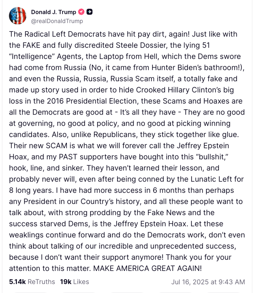 To address this predicament, Trump now wants everyone to believe that Epstein was not in fact a pedophile; that he should not have been prosecuted (during Trump’s first administration) because Epstein did nothing wrong; and—by implication—that Epstein’s lover and co-conspirator, now in jail, did nothing wrong either; and that these wrongful prosecutions were the result of evil Democrats, just like the January 6 prosecutions.